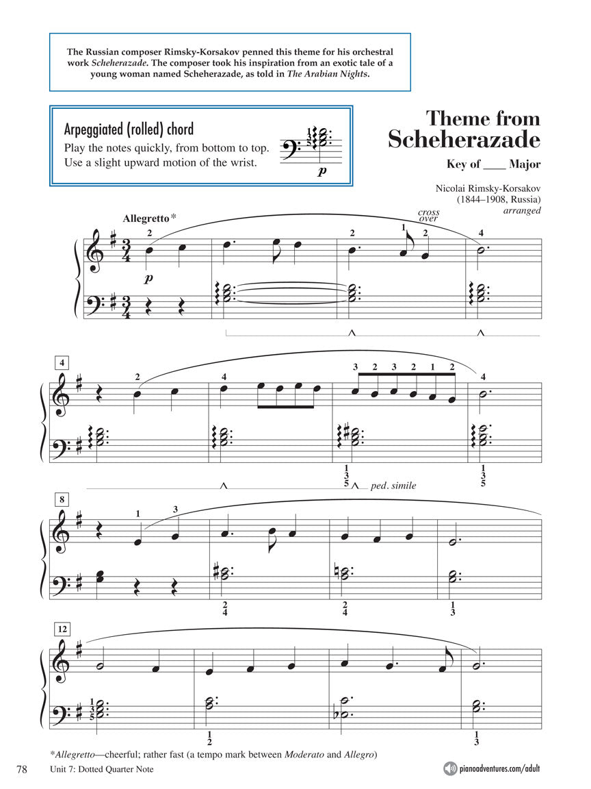 Whether the adult student has just completed Book 1 or is returning to the piano after formerly playing, great pieces await in Adult Piano Adventures Book 2. This convenient “All-In-One” volume offers carefully sequenced instruction in note reading, music theory and piano technique. Its appealing new design clearly introduces concepts such as triad inversions, 3/8 and 6/8 time signatures, 16th-note rhythms, connected pedaling, and major and minor scales, plus a special focus on chord playing with lead sheets of familiar songs. Online support now includes hours of videos and audio accompaniment tracks that inspire rhythmic vitality and artistic expression. Song highlights: 'O Sole Mio! • Sloop John B • Brahms' Lullaby • The Lion Sleeps Tonight • Hava Nagila • Give My Regards to Broadway • Scarborough Fair • Malaguena • Pachelbel's Canon • and more.