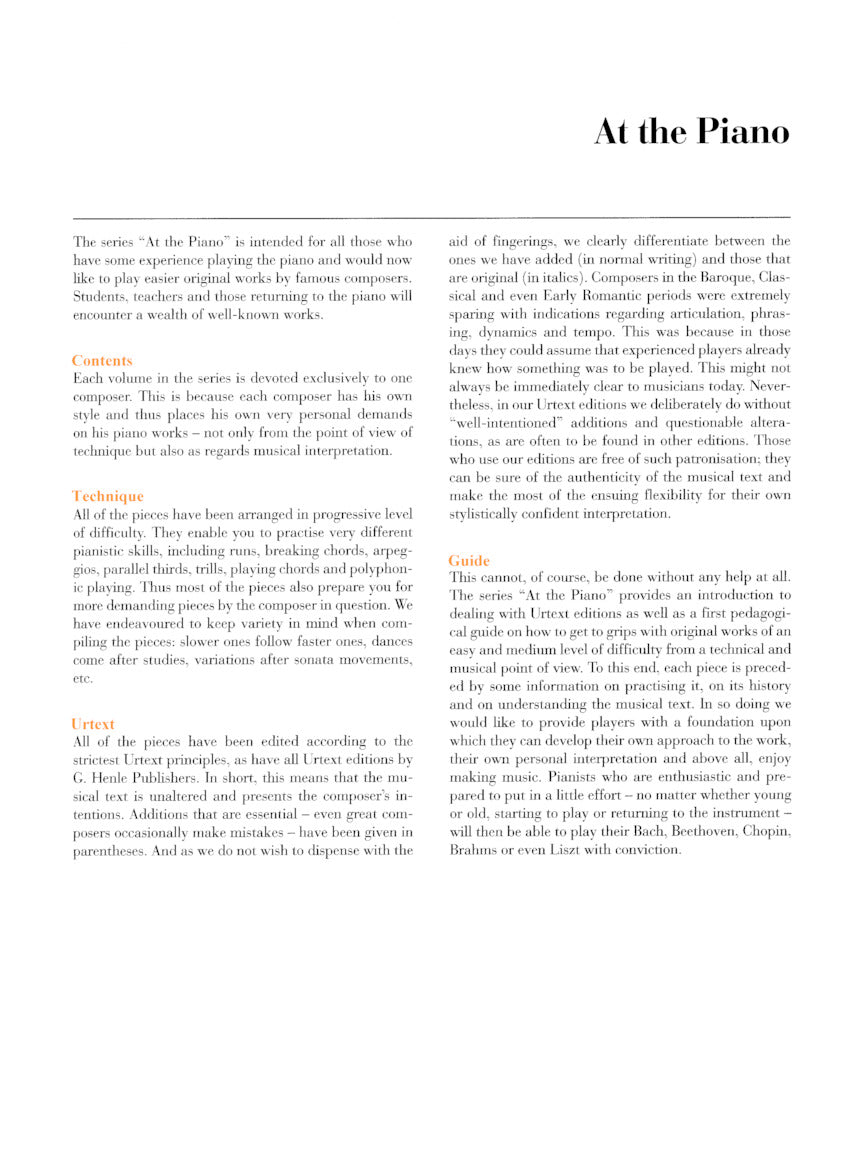 Henle's At the Piano series presents famous pieces in progressive order, with fingerings and a brief essay about each piece, discussing the history and tips on interpretation.
