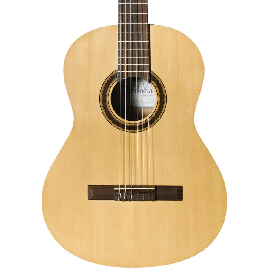 The CP100 is a complete guitar package, perfect for beginners! Included inside the box is a full-size Córdoba nylon string acoustic guitar with Spruce top and nyatoh back and sides, a standard Córdoba gig bag, a digital clip-on chromatic tuner with color display, 2 picks, and a guitar lesson book. All Córdoba guitars come with premium Savarez strings.