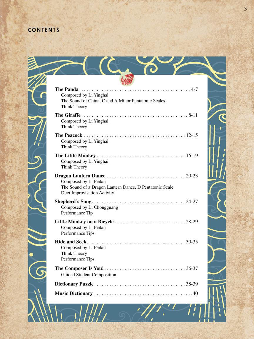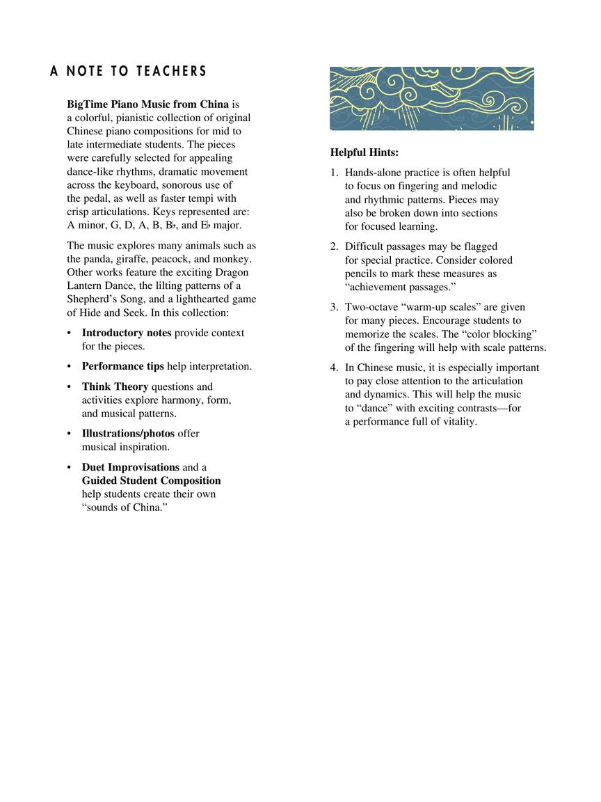 BigTime Piano Music from China is a striking selection of original Chinese compositions perfect for intermediate students (Level 4 and above). Thematically, the music explores a veritable zoo of animals from the real-life panda to the mythical dragon, in addition to traveling the rolling hills of a shepherd and playing a lighthearted game of hide and seek. Colorful introductory notes, vital performance tips, and analytical theory questions aid the student's musical journey, while duet improvisations and a composition exercise provide creative play.