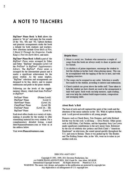 BigTime® Piano Rock 'n Roll allows the pianist to “let go” and enjoy the fun sounds of the '50s, '60s and '70s. Upbeat rhythms and pianistic arrangements make the book a delight for both students and teachers.