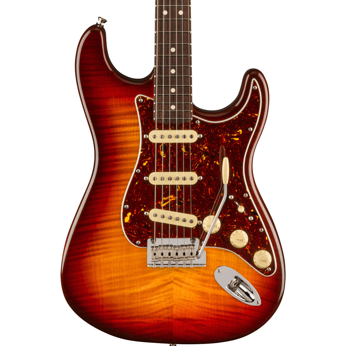 Take your playing to new heights with the 70th Anniversary American Professional II Stratocaster. The alder body, stunning flame maple top and Comet Burst finish exude elegance and class. Equipped with 70th Anniversary V-Mod II Single-Coil Strat® pickups, this guitar delivers dynamic and expressive tones. The Deep "C" neck features smooth rolled fingerboard edges, "Super-Natural" satin finish and sculpted neck heel for a supremely comfortable feel and easy access to the upper register. An upgraded 2-point tremolo with a cold-rolled steel block increases sustain, clarity and high-end sparkle. Deluxe locking tuners ensure exceptional tuning stability. The American Pro II Stratocaster delivers instant familiarity and sonic versatility you'll feel and hear right away, with broad ranging appointments that add up to nothing less than a new standard for professional instruments. The Inca Silver ABS molded case provides reliable protection for your prized instrument.