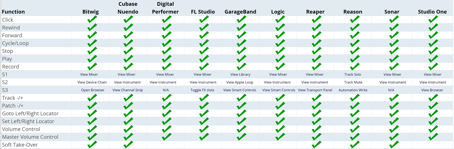 Transport control with ability to goto and set locators, track navigation, volume control, launching windows and patch navigation is all available right from Impact GX. Check out the function overview chart below and see how the Impact GX ticks all the right boxes.