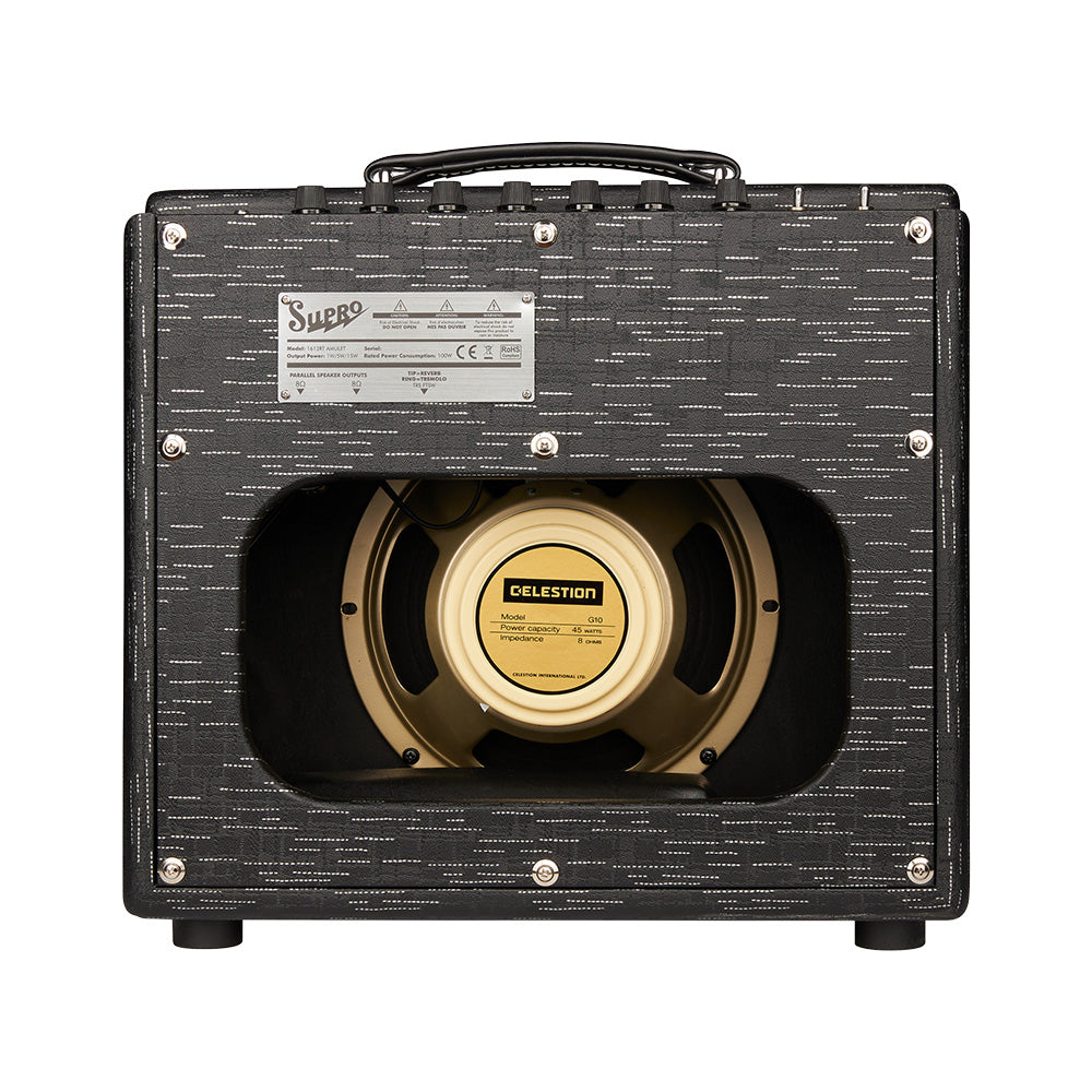 The Supro Amulet is a vintage-voiced combo loaded with all-tube reverb and tremolo along with a new, 3-way switchable power attenuator. Designed for the gigging guitarist, this lightweight tube amp offers 15 watts, 5 watts or 1 watt of all-tube tone through a UK-made Celestion Creamback speaker. The preamp found in the Amulet delivers warm, blooming clean sounds up to ‘noon’ on its volume knob. Past noon, its voice rolls into classic Supro crunch, giving way to a singing, violin-like overdrive at full volume. The Amulet is remarkably high-gain for a vintage-inspired amp, but offers a sweet spot that is not overwhelmingly loud.